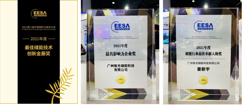 本次大會上,智光儲能獲得“2021年度最佳儲能技術創新金藤獎,“2021年最具影響力企業獎;廣州智光電氣股份有限公司副總裁、總工程師兼智光儲能董事長姜新宇先生榮獲“2021年度儲能行業最佳奉獻人物獎。